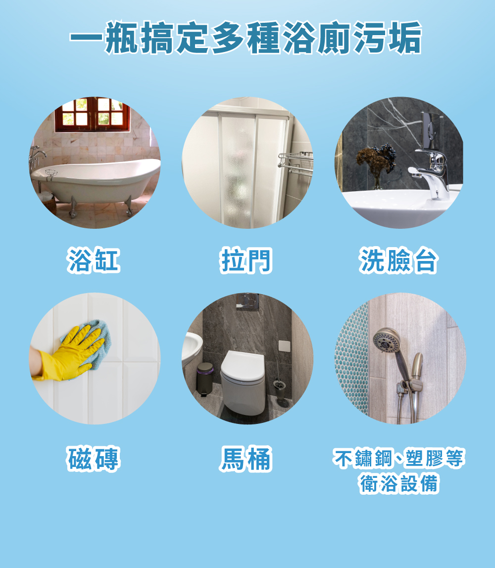 非鹽酸的弱酸性溫和配方,有效清潔又安全環保、芳香不刺鼻
